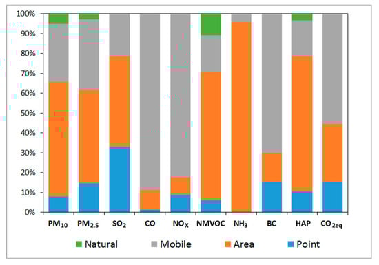 As shown in Figure 5, area sources contribute to high emissions of PM10, PM2.5, NMVOC, ammonia (NH3), SO2, and hazardous air pollutants (HAP) or air toxics. The inventory includes the emissions of 172 toxic species (both gaseous and metals). The seven most abundant are toluene, xylenes, 1,1,1-trichloroethane, isopropanol, hexane, benzene, and methyl tert-butyl ether (MTBE). Key area sources include: Consumer products, solvents, aircraft operations, and fuel in the residential sector. Mobile sources have high emissions of PM10, PM2.5, NOx, CO, NMVOC, black carbon (BC), and greenhouse gases (GHG, expressed as CO2eq). Key mobile sources include: Private vehicles, taxis, microbuses, and heavy-duty diesel vehicles. Point sources have medium-small emissions of all pollutants except for CO and NH3. Key point sources include printing, plastics, food, metallic products, and chemical and electricity generation industries.