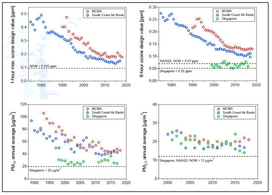 Figure 6 compares the air quality trends (for O3 and PM) in the MCMA, the South Coast Air Basin (SoCAB, consists of Orange County and the non-desert region of Los Angeles, Riverside and San Bernardino with a population of 18 million), and Singapore. The air quality in the MCMA and SoCAB shows similar trends. O3 and PM10 have decreased significantly in both air basins, but even more rapidly in the MCMA, so that the concentrations in the MCMA have approached those in SoCAB in recent years despite a large difference in the institutional capacity, financial resources, and technical personnel, which are necessary for developing and implementing emission control programs. A comparative study of the air quality management between the MCMA and Los Angeles is provided in Chapter 2 of Molina and Molina [14]. In the case of Singapore, the air quality data for the 1980s and 1990s were not available; however, as discussed later in Section 3.3.1, the integrated urban and industrial planning, strict enforcement plan, and cost-effective policies have allowed the control of PM10 and O3. Nevertheless, PM2.5 annual concentrations have not changed along this century, as in the case of the MCMA and SoCAB.