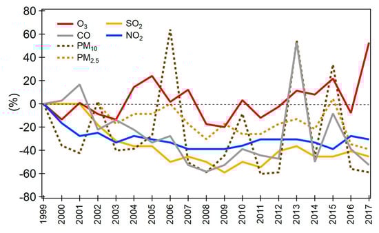 Percentage of change of the annual average concentration with respect to the annual average of 1990 for each of the main air pollutants in the MCMA. For PM2.5, the reference is the annual average of 2004. Averages were calculated for sites with ≥75% of valid data (graphs plotted by authors with information obtained from SIMAT website [22]).