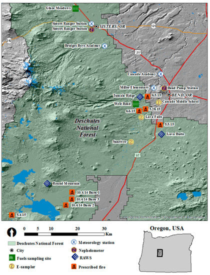 Forest management agencies are increasingly moving away from fire exclusion and toward policies that balance modified suppression with the use of prescribed fire to achieve multiple ecological objectives [1]. Therefore, predicting smoke impacts and, probably more importantly, determining meteorological conditions that reduce smoke impacts from prescribed fires is needed. Few studies addressed this [2,3]. There were comprehensive fuel, fire behavior, and smoke measurements on prescribed fires (e.g., Reference [4]). However, these data were not used to evaluate and improve smoke modeling systems, especially in terms of meteorological conditions. This research was completed in collaboration with the Deschutes National Forest (DNF) to investigate meteorological conditions around Bend, Oregon and evaluate smoke dispersion models with the goal of determining what is required to conduct prescribed fires in the area without causing excessive impacts on nearby communities. The geography of Bend and the DNF provides a complicated environment for prescribed fire from a smoke management perspective due to the complex terrain and the location of burn units typically being upslope from populated areas.