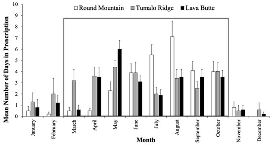 Mean number of days with weather conditions within prescription, by month, 2006–2015 for Lava Butte, Round Mountain, and Tumalo Ridge RAWS locations. Error bars represent the standard error of the mean for each month over the 10-year period. The box surrounding March–October encompasses months when complete data were available.