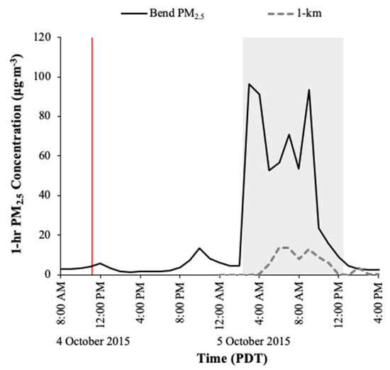 Measured PM2.5 concentrations and concentrations modeled using the 1-km-resolution North American Mesoscale Forecast System (NAM) model on 4–5 October2014, at the Bend Pump Station. The red line indicates time of ignition, and the shaded area represents the time of the intrusion.
