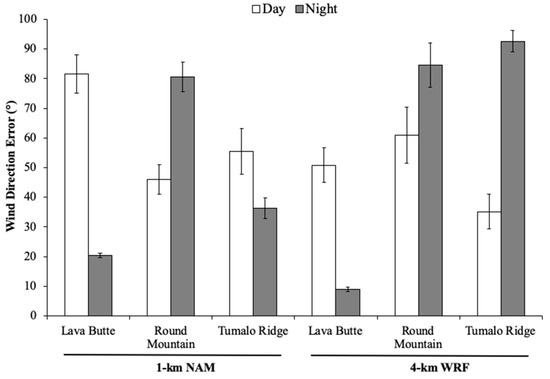 4–6 October2014. Daytime and nighttime mean wind direction error of modeled minus measured wind data at the three RAWS locations. The 1-km-resolution North American Mesoscale Forecast System (NAM) model is on the left side, and the 4-km-resolution Weather Research and Forecasting (WRF) model is on the right side. Error bars represent the standard error of the mean.