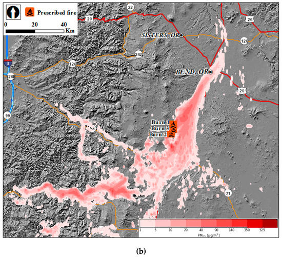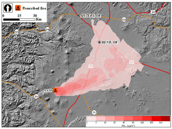 The US Forest Service AirFire research team collaborated with the DNF on a field measurement and modeling project to study the complex interaction of fuels, fire, topography, and wind patterns to better understand smoke intrusions from prescribed fires. During the study, smoke from six prescribed fires intruded into Bend, with 1-h PM2.5 concentrations ranging from 11 μg∙m−3 to 245 μg∙m−3. Both wildfires and prescribed fires were used for large-scale evaluation of air-quality prediction systems that include wildfire emissions (e.g., References [22,23,24]). However, the current study is unique because few case studies synthesized meteorological conditions, smoke dispersion modeling, and ground-based observations, especially for prescribed fires.