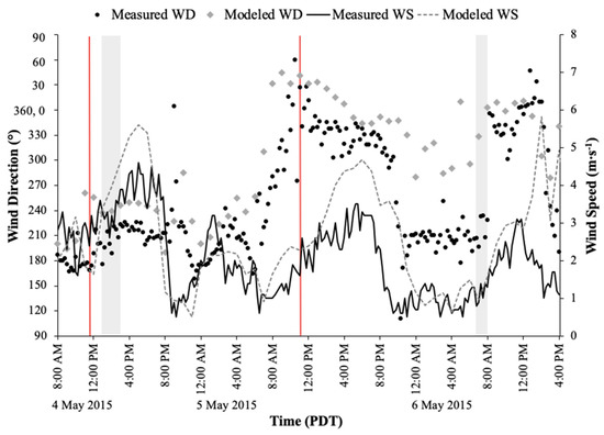 Measured and modeled wind direction (WD) and wind speed (WS) at Cascade Middle School for 4–6 May 2015. Modeled winds are reported from the 4-km-resolution Weather Research and Forecasting (WRF) model operated by the University of Washington. Red lines indicate burn ignition times and gray-shaded areas indicate the smoke intrusion periods into Bend, Oregon. The wind direction scale starts at 90° (coming from the east) and ends at 90°.