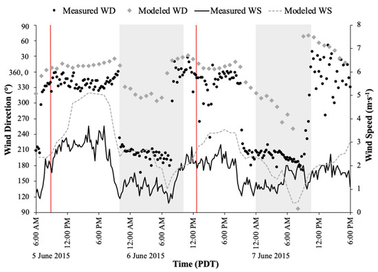 Measured and modeled wind direction (WD) and wind speed (WS) at Cascade Middle School for the 5–6 June 2015 smoke intrusions. Modeled winds are reported from the 4-km-resolution Weather Research and Forecasting (WRF) model operated by the University of Washington. Red lines indicate burn ignition times, and gray-shaded areas indicate the smoke intrusion periods into Bend. The wind direction scale starts at 90° (coming from the east) and ends at 90°.
