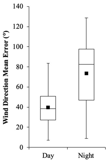 Box plots showing day and night medians (center line), 25th and 75th percentiles (bottom and top of the box, respectively), maximum and minimum values (whiskers), and mean (black box) wind direction errors (modeled vs. observed) for the 2015 intrusion model runs. Modeled winds are reported from the 4-km-resolution WRF data. Calm winds were considered less than 0.25 m∙s−1.