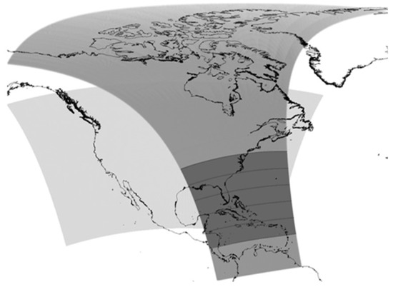 The VIIRS imagery and cloud data products used in this study were collected by the NASA NPP spacecraft that was launched on 28 October 2011. The satellite is in a sun-synchronous, near-circular polar orbit at an altitude of 824 km with an inclination of 98.74 deg, which creates a period of 101 min. The satellite ascends, heading north, across the equator at about 13:30. http://database.eohandbook.com/database/missionsummary.aspx?missionID=413. The VIIRS sensor collects data in 22 spectral bands between about 0.4–12.0 µm. At nadir, the cross-track scanning sensor captures imagery (375 m or high resolution) data and radiometric (750 m or moderate resolution) data. The resolution of both types of data increases by a factor of 2 as the VIIRS sensor scans from nadir to the edge of its 3000 km data swath. Comprehensive details about the VIIRS instrument design have been published [9]. An overview can be found at http://database.eohandbook.com/database/instrumentsummary.aspx?instrumentID=412.