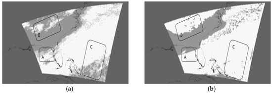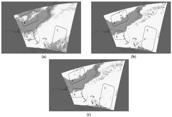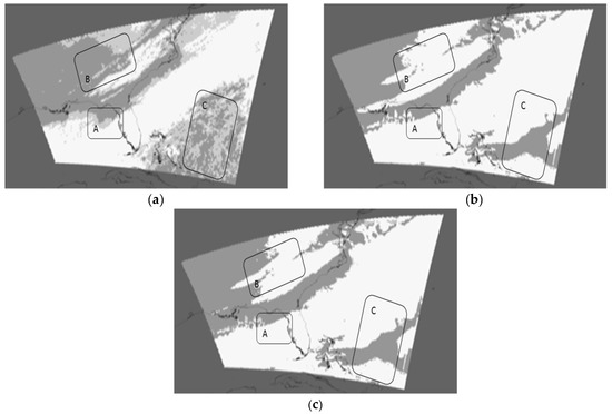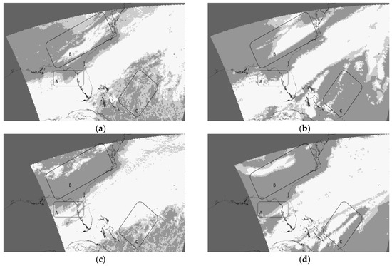 The images in Figure 5a,b show two key deficiencies in the WRF simulations. First, the CLDFRAmax values tend to be binary, as expected based upon the results shown in Section 3.4. Far fewer WRFrst grids contain clouds in the lighter gray shade in Figure 5b, i.e., within the 10–90% CCf range, than are found in the CCftruth image (Figure 5a). Table 3 quantifies the difference between the CCftruth values and those in the CLDFRAmax image created from the WRFrst file. Binary cloud fields account for 99.5% of the forecasts in the CCfWRFrst file while they account for only 76.9% of the grids in the CCftruth image. Secondly, the WRFrst file contains too many clouds, i.e., the model over-clouds the low as well as high level clouds in most regions of the scene. For example, over-clouding in the WRFrst file is seen in the stratocumulus fields (Area A) over the Gulf of Mexico, in most areas over the southeastern-eastern US landmass (Area B), and over the open Atlantic Ocean area northeast of Cuba (Area C). Thus, matchups that contain lower-level water clouds, which appear as the middle gray shade in Figure 3a and Figure 5a, become key candidates for update (bogusing).