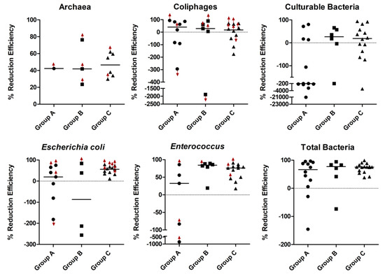 Percent reduction efficiencies of ATU against all detectable studied microorganisms. The graphs represent ATU reduction efficiencies for archaea, F+ RNA coliphages (group I), bacteria cultured on tryptic soy agar (TSA), Escherichia coli, Enterococcus, and total bacteria by qPCR. Red arrows refer to reduction efficiencies calculated using the limit of quantification for downwind or upwind data.