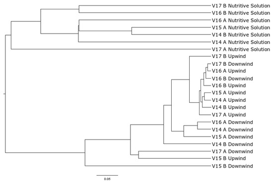 Dendrogram of samples. V## identifies the visit, A or B identifies the unit for upwind, downwind, and nutritive solution samples.