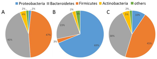 Relative abundances of phyla in samples. Pie chart percentages are averages of all samples in (A) non-treated air (upwind), (B) nutritive solution, and (C) treated air (downwind).