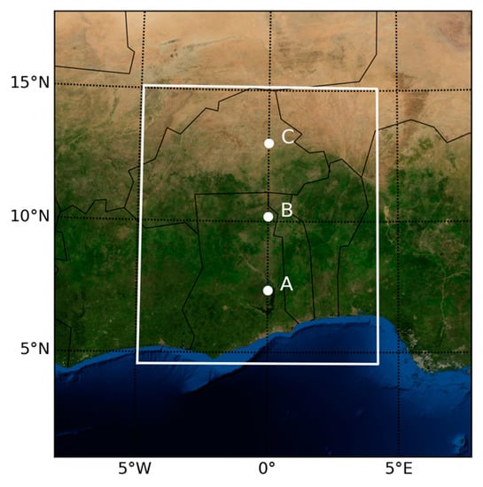 Study Area “Burkina Faso, Ghana and Benin” (4.92° W–4.22° E, 4.56° N–15.08° N) and three grid points for the evaluation, each representative for Guinea Coast—A (7.37° N, 0.00° E), Sudan—B (10.18° N, 0.00° E) and Sahel—C (12.98° N, 0.00° W).