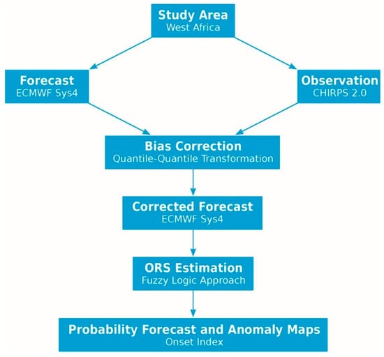 Schematic overview of the different components of the forecasting procedure for the onset of the rainy season (ORS) proposed in this study. CHIRPS 2.0 = Climate Hazards Group Infrared Precipitation with Station data version 2, and ECMWF SYS4 = seasonal forecast system SYS4 of the European Centre of Medium Range Weather Forecasts.