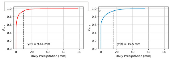Figure 3 shows an example of a quantile–quantile transformation of daily precipitation amounts to better understand the approach described above. Here y(t) corresponds to the original value of the forecast and y’(t) to the forecast value corrected by the inverse cumulative distribution function of the observation.
