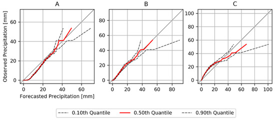 The analysis of the joint distribution of the forecasts (SYS4) and the observations (CHIRPS) is done by a quantile–quantile plot, in which the daily sorted forecasted and observed precipitation values are represented in a coordinate system against each other. At this point it should also be mentioned that due to the grid-based determination of the ORS in Section 3.2, the focus is on the data of the individual grid points and therefore no temporal or spatial aggregation is performed. Accordingly, this analysis evaluates three grid points, each representative for different climate regions of the study zone: Guinea Coast (A), Sudan (B) and Sahel (C). Figure 4 shows the quantile plots for selected grid points of these zones for the 15 SYS4 ensemble members using selected quantiles (Q10, median, Q90). The distribution of the CHIPRS observations is relatively good captured by the SYS4 ensemble members, in particular for the Sudan zone. However, the analysis also reveals several systematic deviations between the SYS4 ensemble and the CHIRPS observations. For instance, smaller precipitation amounts (<20 mm/d) are strongly overestimated by the SYS4 ensemble for the grid point A located in the Guinean coasts. In addition, the SYS4 ensemble shows a quite diverse picture for the Sahel region with underestimations of the lower precipitation range (<30 mm) and overestimations of the upper precipitation range (>30 mm). Overall, Figure 4 indicates that the intra-ensemble biases of raw SYS4 forecasts are comparable to CHIRPS, i.e., the CHIRPS lies within the distribution of the SYS4 ensemble simulations. For high precipitation values, the SYS4 distributions are wider compared to small values. This is to be expected due to the fact that high precipitation values are less frequent and might be affected more heavily by stochasticity, coming from uncertainties from the model initial conditions and other limitations of the model such as parameterization options and non-adequate model equations [48]. Due to the systematic deviations for the small precipitation values (as discussed above), a statistical bias correction is applied in this study. This bias correction is done for each ensemble member separately.