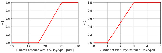 A shortcoming of the approach by [50] is its binary logic. An accumulated precipitation sum of 24.9 mm is not identified as the onset of the rainy season although only 0.1 mm is missing to fulfill the criteria. Since many other ORS approaches rely on binary logics, [17] introduced fuzzy rules for a more smoothed transition of the applied conditions. This ORS fuzzy-logic were used by several other investigations, as well [2,51]. The membership functions of the fuzzy rules used in this study are shown in Figure 5. For example, for condition 1, accumulated precipitation amounts of less than 18 mm receives a membership value of 0, and above 25 mm a 1. In the range between 18 and 25 mm, normalized values between 0 and 1 are assigned by linear interpolation. Thus, the probabilities of being interpreted as ORS are increasing with precipitation rates larger than 18 mm. A similar membership function is applied to condition 2, which is supposed to exclude single rainfall events to be misinterpreted as ORS. It must be noted that the membership functions were optimized for the Volta Basin of West Africa [17], and therefore could be assumed to be reasonable for our study area.
