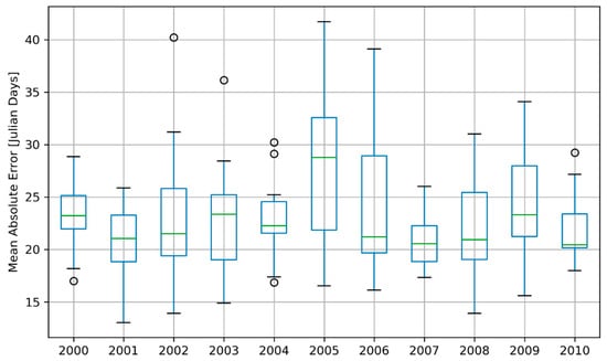 The spatial accuracy of the ORS forecasts is shown in Figure 6 in terms of the MAE. The MAE was computed for each ensemble member and based on this information a box-plot diagram was produced for each year. Thus, the mean of the box plots shows the average accuracy of the ensemble forecasts for a given year and the box-plot spread the performance differences between the ensemble members. The mean MAE over the study period is 23.3 days, which indicates a relatively low accuracy for the prediction of the ORS dates in this region. This outcome can be expected because the prediction of precipitation characteristics on a much coarser temporal scale (e.g., monthly or seasonal precipitation amounts) is already characterized by low performance as shown by [13]. Moreover, seasonal forecasting of specific daily precipitation characteristics like ORS dates is a much more challenging task in comparison to seasonal forecasting of monthly or seasonal precipitation amount (or other meteorological variables like temperature). Reasons are the inherent high uncertainty of long-range forecasts products like seasonal forecasts and the high stochastic character of daily precipitation events, in particular in monsoonal regions like West Africa. Another reason is the uncertainty coming from the reference products used for comparison. This is shown e.g., by [51] for the calculation of the ORS dates for West Africa. Figure 6 also shows strong variations of the forecast performance of the ORS dates for the different years indicated by the mean and the spread of the box-plot diagrams. For some years the ORS forecasts were much better (e.g., 2007) in comparison to other years (2005).