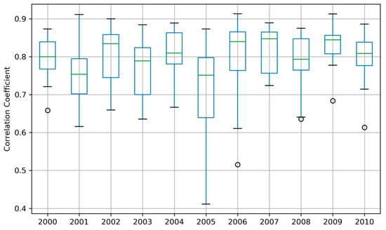Spatial verification of the ORS fields based on the correlation coefficient. The calculation was done for each of the 15 SYS4 ensemble members (initialized in February) compared to CHIRPS for the entire study region. The statistics used for the visualization of the box and whisker plots are the same as for Figure 6.