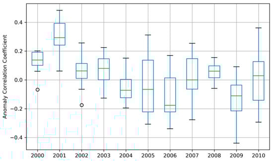 Spatial verification using the anomaly correlation coefficient. The calculation was done for each of the 15 SYS4 ensemble members (initialized in February) compared to CHIRPS for the entire study region. The statistics used for the visualization of the box and whisker plots are the same as Figure 6.