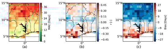 In addition, a temporal verification of the ORS forecasts is performed in this study. The verification measures are calculated for each grid cell by comparing the predicted ORS time series with a time series of the ORS observations. The verification measures are calculated for each ensemble member separately and afterwards an averaging of this sample is conducted. The outcome of this calculation is shown for the MAE (a), r (b) and bias (c) in Figure 9. It shows strong regional differences regarding the accuracy of the ORS forecast. The MAE values gradually decrease from the South to the North with a MAE of approximately 15 days in the southwestern part of the study domain near the Guinean coastline and more than 35 days in the northern part of the study domain. Thus, the accuracy of the ORS forecasts is much higher for the Guinean zone in comparison to the Sudan-Sahel region. Several studies already showed that seasonal precipitation forecasts for West Africa have usually a higher performance for the Guinean zone compared to the poleward located climate zones like the Sudan-Sahel or Sahel (e.g., [11,22]). Ref [22] mentions that those regions have a higher skill where precipitation is stronger interlinked with oceanic surface conditions. Another explanation for the lower model accuracy in the Sahel region can be the higher stochastic nature of the precipitation events in this region compared to the Guinean zone since most of the rainfall is the result of convective systems in the Sahel region (see [56]; and references herein). However, the gradual decline of the MAE values can also be a purely operational effect. The ORS dates in the Guinean zone are based on much shorter lead times in comparison to the ORS dates in the Sahel zone, and the accuracy of the ORS prediction should theoretically decrease with shorter lead times.