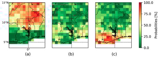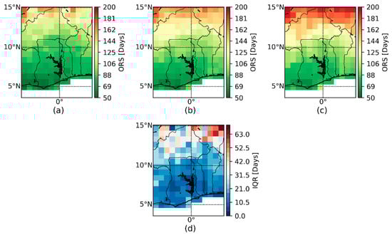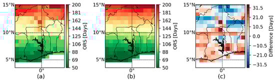 The quantile-based ORS maps show a clear north–south gradient of the ORS dates. In this respect, a relatively realistic pattern is produced for the forecasts. The information based on the terciles can also be interpreted as an early and late ORS date. The difference between the late and the early ORS dates is an estimation of the forecast uncertainty. The uncertainty is quite large although only 1/3 of the ensemble is used for the illustration. Figure 10d also indicate that the uncertainty increases from the Guinean coastline to the Sahel zone due to the different lead times and other reasons as discussed in the previous section. Moreover, a comparison of Figure 10a–c with Figure 11a reveals that many observations are not enclosed by the selected uncertainty interval. The approach produces for the southern parts of the domain too early ORS dates and too late ORS dates for the northern part of the domain. This shows that the selected quantiles are too narrow to enclose all observations. If more extreme quantiles (e.g., Q90 and Q10) are used for the calculation of the late and early ORS dates, the observations will be better enclosed by the uncertainty interval. However, this will also strongly increase the range of the illustrated forecast uncertainty.
