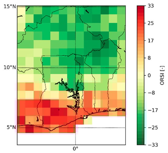 The area of interest in this study (Figure 1) is West Africa with a focus on Burkina Faso, Ghana and Benin (4.92° W–4.22° E, 4.56° N–15.08° N). West Africa’s climate is characterized by the West African Monsoon (WAM), which is mainly controlled by the meridional migration of the sun and the associated solar climate [24]. Many rainfall characteristics like the date of the ORS in this region are strongly related to the seasonal migration of typical WAM features such as the intertropical convergence zone (ITCZ). In August, the ITCZ reaches its northernmost position at about 11° N and retreats to the Gulf of Guinea in the northern winter, where it remains close to the equator. Due to the migration of the ITCZ, the Guinea coast therefore has a bimodal rainfall distribution with relatively dry conditions from December to February and a second minimum with much wetter conditions during the peak period of the West African Monsoon in July, August and September. The rainfall amounts in the area north of 9° N reaches its peak in August and the duration of the rainy season strongly shortens towards the Sahara [25]. The study area is also characterized by a strong interannual [24] and annual [3] variability of precipitation as well as decadal variability, which lead to substantial variations of ORS dates and prolonged droughts over this region [26]. In addition, climate change seems to influence rainfall characteristics in the Sahel zone, such as false starts and early cessation of rainy seasons or increased frequency of intense daily rainfall [27,28]. Ref [29] also show an increasing precipitation intensity with a higher average precipitation per rainy day, a 5–10 days later start and end of the rainy season, but only a marginal change in the overall duration of the wet season.