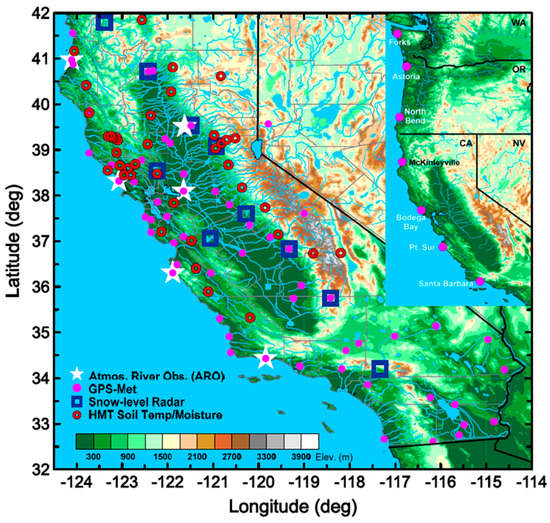 - White, A.B.; Anderson, M.L.; Dettinger, M.D.; Ralph, F.M.; Hinojosa, A.; Cayan, D.R.; Hartman, R.K.; Reynolds, D.W.; Johnson, L.E.; Schneider, T.L.; et al. A Twenty-First-Century California Observing Network for Monitoring Extreme Weather Events. J. Atmos. Ocean. Tech. 2013, 30, 1585–1603. [Google Scholar] [CrossRef]
