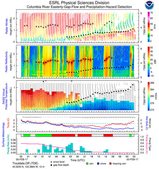 - Neiman, P.J.; Gottas, D.J.; White, A.B.; Schneider, W.R.; Bright, D.R. A Real-Time Online Data Product that Automatically Detects Easterly Gap-Flow Events and Precipitation Type in the Columbia River Gorge. J. Atmos. Ocean. Tech. 2018, 35, 2037–2052. [Google Scholar] [CrossRef]