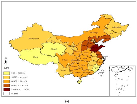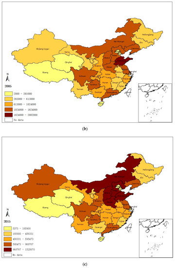 In order to illustrate the geographical distribution of China’s regional sulfur emissions intuitively, natural breaks (Jenks) in ArcGIS are employed to divide the 31 provinces into five categories according to their emissions’ level. Figure 1 illustrates that the spatial distribution of provincial SO2 emissions (1995, 2005, and 2015) is likely to be subject to a certain pattern: (1) a lot of emissions activities cluster in a few provinces; (2) provinces of higher emission level tend to agglomerate together, and so do the provinces with lower emission level; and (3) the western areas tend to be less emission-intensified compared with the northern regions, resulting in a more concentrated and unbalanced spatial pattern of sulfur emissions.