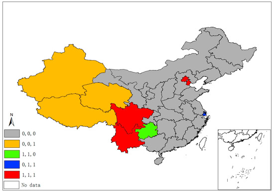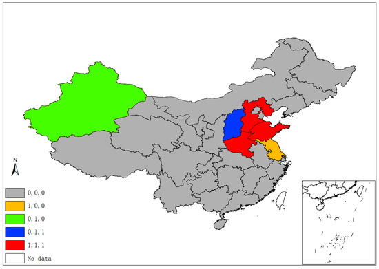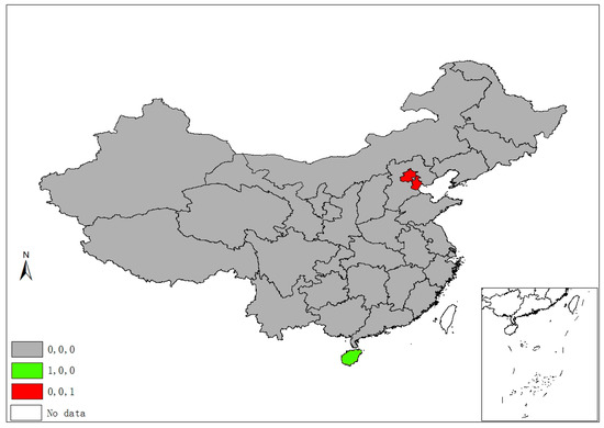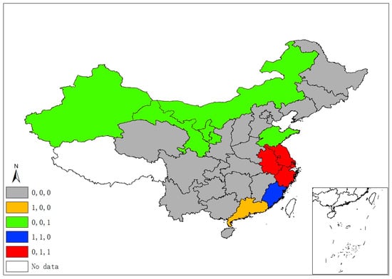 Figure 2 demonstrates five classes of sulfur’s space–time stability. A province is identified as “1, 0, 0”, if it was a significant hot/cold spot in 1995, but not in the latter two years. A province is labeled “0, 1, 0” if it was a significant spot in 2005, but not in 1995 and 2015. Hence, the “0, 1, 1” pattern suggests that a province unit remained a significant spot in latter two years, but not in 1995, and “1, 1, 1” suggests a province was a significant spot in all three years. Finally, if a province had never been a significant spot in any year, it is labeled “0, 0, 0”. Following this manner, Figure 3, Figure 4 and Figure 5 demonstrate different categories of space–time stability of fdi, stru, and urb, respectively.