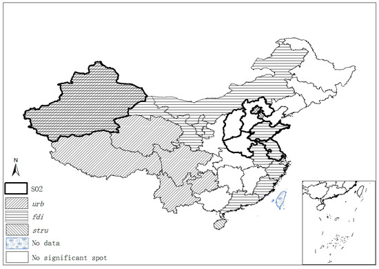 Six provincial units were the SO2 emissions significant hot/cold spots of different four classes, mainly locating at/round the Beijing–Tianjin–Hebei region, which is also the area with more serious air pollution (e.g., smog) in China. Regarding the FDI index, eleven provinces are reported in four categories of significant spots that are mostly located in the north and the eastern coastal economic belt. Significant spots of industrial adjustment index (stru) are identified in three provinces/municipalities (Beijing, Tianjin, and Hainan) with three categories, while significant urbanization spots are identified in the western areas and Beijing, Tianjin, and Shanghai.