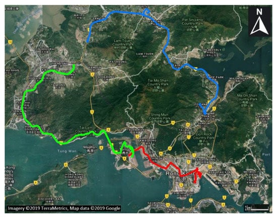 The experimentation was conducted during the period from 2011 to 2018 and included a mix of free driving and fixed routes in the wider metropolitan area of HK, comprising a combination of urban, rural and highway driving. Three indicative test routes are presented in Figure 1. Tests were spread over different weekdays and hours of the day to cover a range of typical busy morning and early afternoon conditions, as well as afternoon rush hours. Trips were also spread over all seasons of the year. As a result of the driving conditions mix, the available emissions data correspond to a wide range of driving, operating, and ambient conditions. The average duration of a trip included approximately one hour of PEMS measurements (the one-hour testing duration was selected due to data management and technical/measurement reasons). The average distance traveled per trip was 44.5 km.