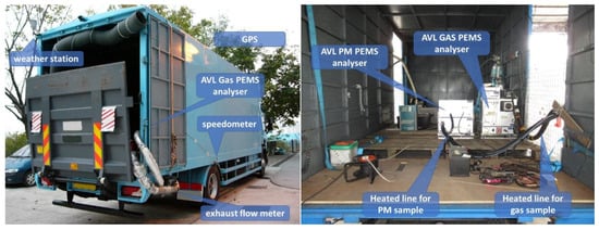 HDDT in test setup configuration. Left photo: GPS (global positioning system), SEMTECΗ EFM-2 or EFM-HS flowmeter (Sensors, Inc., USA), AVL M.O.V.E. GAS/PM PEMS analyzers, speedometer (Peiseler GmbH, Germany), weather station. Right photo: AVL M.O.V.E. GAS PEMS and AVL M.O.V.E. PM PEMS.