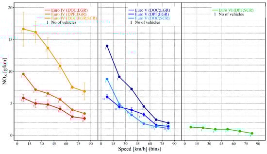 The NOx distance-based fuel consumption levels as a function of speed for the different Euro standards and emission control technologies are depicted in Figure 3. Singular emission values over speed were based on respective 500 m distance-integrated driving sequences data and these were then binned to 15 km/h-classes of average speed. In Figure 3, dots represent the average NOx levels for the (n) number of vehicles falling into this particular bin. The error-bar ranges correspond to the standard error limits (average ± standard error) of these (n) values. A monotonic decrease in emissions with speed is observed, indicating the clear effect of speed.