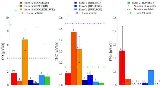 The respective energy-based emission levels, calculated as the median of the corresponding speed-bin values, and the associated Euro standard limits are presented in Figure 4 (n.a. denotes vehicle classes where no measurements/data were available). PM emission levels for Euro IV vehicles and the Euro V (DOC, SCR) one are above the respective regulatory limits (Euro IV: 0.03 g/kWh, Euro V: 0.03 g/kWh, Euro VI: 0.01 g/kWh). The Euro V (DPF, EGR) vehicle was measured below the limit. Euro IV (DOC, EGR) vehicles have the highest PM emission levels, whereas the Euro V (DPF, EGR) vehicles have the lowest ones, but very close to the PM emissions of Euro IV vehicles of similar technology. In both Euro classes, the DPF-equipped vehicles appear to have lower emissions than the respective DOC-equipped ones.