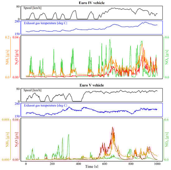 The N2O, NH3, and NOx emission mass rates and the exhaust gas temperature profiles of a trip excerpt example for a Euro IV and a Euro V HGV are illustrated in Figure 5.