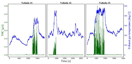 A number of DPF regenerations were observed during the HDDTs’ testing campaign, originating from nine different vehicles. Table 6 presents the main characteristics for 19 representative regeneration cases (events that started and were completed during a single trip). THC emissions and exhaust temperature were the two quantities that appeared to be most affected by these events, exhibiting some extremely high levels during the regenerations, as presented in Figure 6 (regeneration events correspond to three different vehicles).
