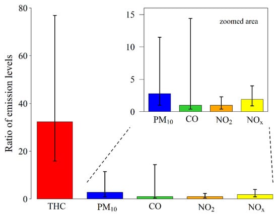 To obtain a view of the effect of regenerations on pollutant emissions, we calculated—for each regeneration and pollutant—the ratio of the distance-based emission level of the pollutant during the regeneration event over the respective emission level before the start of the event, i.e., at no regeneration conditions, and at the same average speed. As the respective distribution of the ratios (per pollutant) was significantly skewed for some of the pollutants, e.g., CO, including both very low and very high values, Figure 7 presents the median value of these ratios along with the respective 10th and 90th percentiles. THC levels during the regeneration were 32 times as high as the levels under no regeneration conditions. However, the effect of DPF regeneration on NOx and CO is less significant or less clear, respectively, compared to THC emissions. NOx emissions during the events were found to be higher than the respective ones under no regeneration conditions by a factor of 1.9. CO emissions exhibit a mixed performance as both increasing and decreasing trends were observed, CO emissions during regenerations were measured to be at similar levels as before regenerations (median = 1), but also a few high ratio values were observed. PM emissions during regeneration were measured to be 2.8 times as high as the respective levels before regeneration. DPF regeneration seems to impact the rather low-level THC emissions and also PM emissions.
