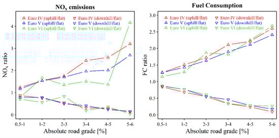 NOx emissions and fuel consumption (FC) ratios of uphill (road grade > +0.5%) and downhill (road grade < −0.5%) driving over flat road driving (|grade| < 0.5%) as a function of absolute road grade classes for Euro IV, Euro V, and Euro VI HDDTs (500 m driving sequences data).