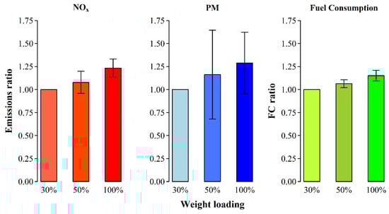 Average NOx and PM emissions ratios and FC ratio over the respective 30% loading reference values for the 30%, 50%, and 100% weight loadings, the error bars correspond to the respective ± one standard deviation limits.
