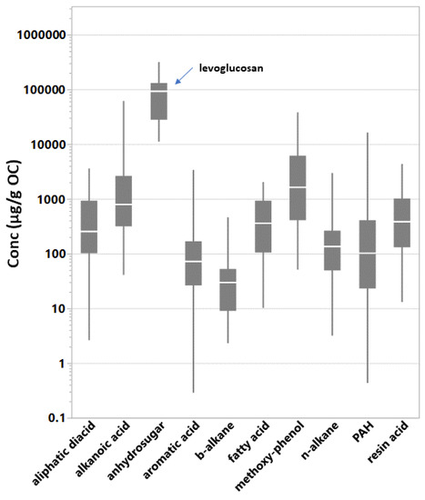 Quantile box plots of individual SVOC concentrations pooled by compound class. Levoglucosan is the anhydrosugar. The line in the box is at the median. The whiskers indicate the 10% and 90% quantiles. SVOC data populations (Table 2): aliphatic diacid (n = 81); alkanoic acid (n = 160); anhydrosugar (n = 15); aromatic acid (n = 103); b-alkane (n = 30); fatty acid (n = 48); methoxy-phenol (n = 84); n-alkane (n = 296); polycyclic aromatic hydrocarbons (PAH) (n = 332); resin acid (n = 38).