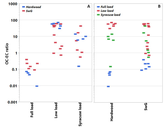 Filter-based OC–EC ratios in PM for individual tests sorted by heat load demand profile and fuel type. Panel A pools the OC–EC ratios by fuel type, whereas panel B pools them by operational mode. Data populations: Full load (n = 10), low load (n = 18), and Syracuse load (n = 11).