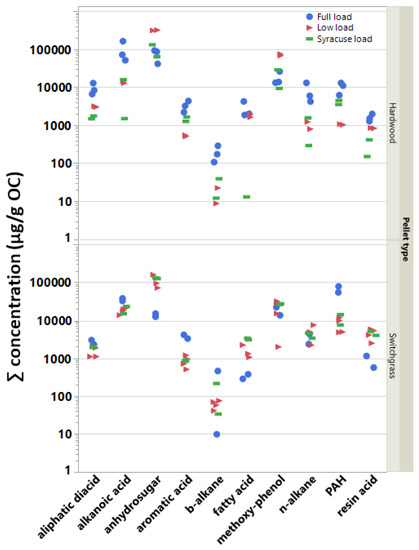 The mean concentrations of resin acids, fatty acids, and methoxy-phenols in the organic aerosol particle emissions showed no significant difference under the different BB test load conditions used in the present study. However, the full load conditions produced significantly higher mean concentrations (g/g OC) than both Syracuse and low load conditions for several compound classes (aliphatic diacids, alkanoic acids, n-alkanes, and PAH). Moreover, compared with full load testing, low load tests produced significantly higher levoglucosan and lower aromatic acid concentrations in the organic PM. Finally, a one-way analysis using a data pool including all measured organic compounds irrespective of class showed no significant difference among pairs of means representing test load conditions and pellet type.
