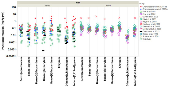 Comparison of PAH concentrations in PM (mg/g PM) emitted from wood- and pellet-burning appliances. Data populations for individual compounds ranged from n = 57 to n = 92. Figure S5 shows the calculated means with standard error and median values for individual PAH concentrations gathered across the multiple studies. These values are provided in an effort to highlight differences and provide consensus.