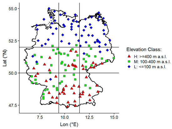 Geographical distribution of the meteorological stations with the corresponding elevation classes. The two horizontal lines divide the stations into northern, central, and southern stations. The vertical lines divide the stations into western, central, and eastern stations.