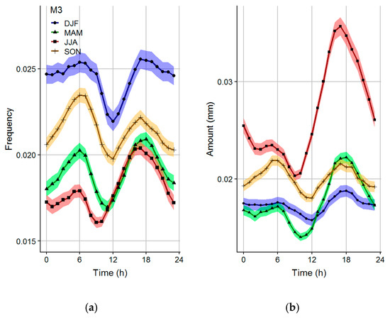 Precipitation diurnal cycles (PDC) for each season represented by the long-term averages of (a) the hourly precipitation occurrence frequency and (b) the hourly precipitation amount with the shaded 95% confidence intervals.