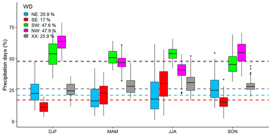 Percentage of wet days per wind direction (WD) in different seasons. The boxplots represent the distribution of this percentage across all stations. The horizontal colored lines and associated numbers in the legend represent the mean percentage across all years and stations, regardless of season. For the WD classes, see Section 2.1. In each boxplot, outliers are represented by black dots, the median is represented by the horizontal thick line, and the lower and upper hinges represent the first and third quartiles, while the upper (lower) whisker extends from the upper (lower) hinge to the largest (smallest) value no further than 1.5 times the interquartile range from the hinge [57].