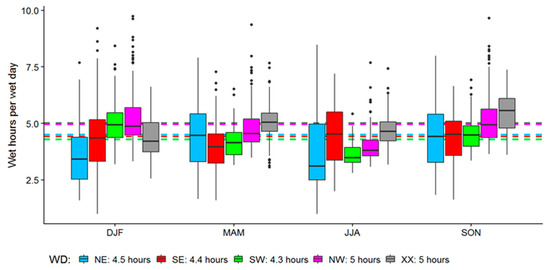 The comparison of wet hours per wet day revealed that the differences between the WD classes were negligible (Figure 6). XX had the highest annual mean value with 4.9 wet hours per wet day. NE had ~1 h less than the smallest annual mean. The NW and the SW scored higher averages than the remaining classes only in winter.