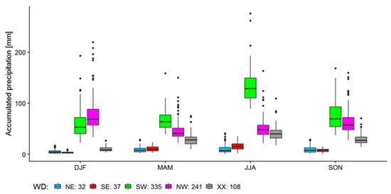 Boxplot of precipitation sums per wind direction (WD) in each season averaged over the measurement years for all stations. The numbers in the legend are the mean precipitation sums per year for each WD averaged over all stations in mm. For the WD classes, see Section 2.1. The representation of the boxplot is same as explained in Figure 5.